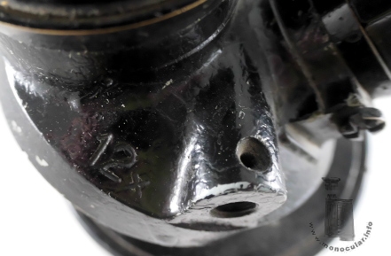 | Das schwarz lackierte Prismen-Fernrohr aus Messing mit den Werten 12x, 20x80 ist die rechte Hälfte eines Marine-Doppelfernrohrs der Marke (Huet) S.G.O. Der Okularrevolver hat ein Gewindeloch zur Befestigung eines Griffs (s. Bild 4 ein anderen Exemplars), mit dem sich der Revolver drehen auch bei nassen, kalten Wetter und Handschuhen ließ. Neben den Okularen sind die Vergößerungs am Deckel angegeben. Die Okulare haben einen Dioptrienring mit Skala von +2 b is -4, haben senkrecht geriffelte Fokussierungsrine und Metallaugenmuscheln. Das runde Prismengehäuse hat einen ÜBerwurfring zum Öffnen und unten drei kleine Zapfen - scheinbar ohne Funktion - sowie eine Trockenpatroneneinrichtung. Der konische Tubus hat eine alte oder nachträglich neue Montageklammer, an der nachträglich eine Stativbefestigung geschraubt wurde. Am geraden Objektivtubus, der noch die vermutlich originale graue LAckierung hat, lässt isch eine Sonennblende ausziehen. | This black-painted brass prism telescope with 12x and 20x80 specifications is the right half of a (Huet) S.G.O. marine binocular. The eyepiece turret has a threaded hole for attaching a handle (see image 4 of another specimen), allowing the turret to be rotated even in wet, cold weather and while wearing gloves. The magnifications are indicated on the cover next to the eyepieces. The eyepieces have a diopter ring with a scale from +2 to -4, vertically knurled focusing rings, and metal eyecups. The round prism housing has a retainer ring for opening at its top and three small studs at the bottom—apparently without function—as well as a desiccant cartridge mechanism. The conical tube has an old or later new mounting clamp, to which a tripod mount was screwed. A sun-shade can be extended from the straight lens tube, which presumably still has its original gray paint finish. |