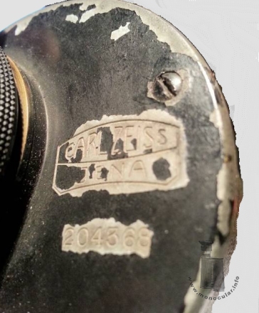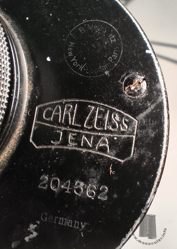 | Der zweifach verschraubte Gehäusedeckel steht an einer Seite am der Gehäusedose über, um Platz zum Einschrauben des Fokussier-Okularstücks zu bieten. Der Deckel ist rechts vom Okularstück mit dem Zeiss-Linsen-Logo sowie einer Seriennummer beschriftet (hier: Nr. 204368). Weitere Exemplare haben Inschriften der Vertreiber. Tela Nr. 204355 wurde über "James Brown Optician Glasgow" verkauft. Tela Nr. 204362 trägt in kleinerer Schrift die Gravuren "Germany" - als Exportmodell - und im Kreis "E. B. Meyrowitz • New York • London • Paris", dem vertreibenden Optikhändler. Das Steckokular ist an der schwarz lackierten Augenmuschel seitlich mit "Carl Zeiss Jena" und oben als "Kellner'sches Okular" und der jeweiligen Brennweite gekennzeichnet. | The housing cover has two screws. It protrudes on one side of the housing to provide space for screwing in the focusing eyepiece. The cover is marked to the right of the eyepiece with the Zeiss lens logo and a serial number (here: Nr. 204368). Other examples bear distributor inscriptions. Tela No. 204355 was sold through "James Brown Optician Glasgow". Tela No. 204362 has in smaller print the engravings "Germany" – indicating an export model – and, within a circle, "E. B. Meyrowitz • New York • London • Paris", the optics retailer. The eyepiece is marked on the side of the black-painted eyecup with "Carl Zeiss Jena" and on top as "Kellner'sches Okular" (Kellner eyepiece) along with its respective focal length.. |