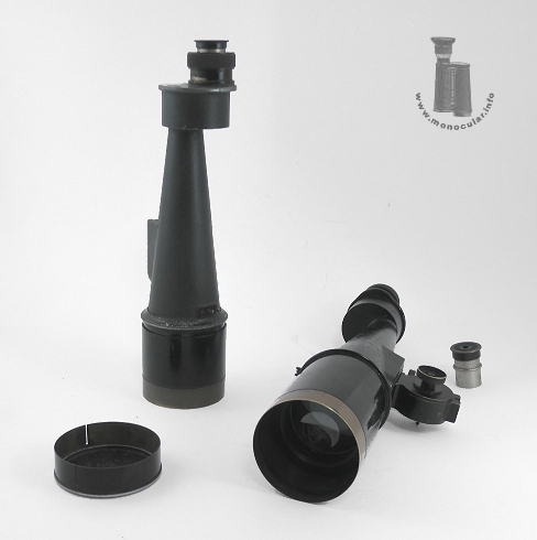 The successor to the short-focal-length observation telescope "Stanziava" was the "Tela" (see catalog Astro 53 from VIII 1921) after World War I, which was presumably available until the end of the 1920s. This telescope was also supplied with two interchangeable eyepieces, offering a choice of 12x, 15x, 20x, and 24x magnification. The objective lens diameter remained unchanged at 60 mm, as did the focusing mechanism using a rotating eyepiece tube, the Porro II prism system, the conical objective tube with extendable sunshade, and the dovetail mount for the tripod adapter. The sighting device had a front sight (bead) screwed on at the end of the conical tube. The 15x60 model with a fixed eyepiece, built for signal troops in World War I, was very similar in design to the Tela. |