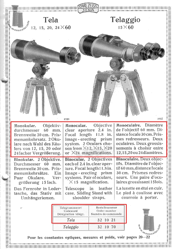 | Nachfolger des kurzbrennweitigen Aussichtsfernrohre "Stanziava" war nach dem 1. Weltkrieg das "Tela" (s. Beleg Katalog Astro 53 von VIII 1921) bis vermutlich Ende der 20er Jahre. Auch dieses wurde mit zwei Wechselokularen nach Wahl unter 12x, 15x, 20x und 24x geliefert. Gleich geblieben war der Objektivdurchmesser von 60 mm, die Fokussierung mittels eines drehbaren Okulartubuses, ein Porro-II-Prismen-System, ein konischer Objektivtubus mit ausziehbarer Sonnenblende und eine Schwalbenschwanzmontierung für den Stativadapter. Für die Visiereinrichtung gab es ein angeschraubtes Korn am Ende des konischen Tubuses. Das im 1. Weltkrieg für Signaltruppen gebaute 15x60 Modell mit festem Okular war der Bauform des Telas sehr ähnlich. |