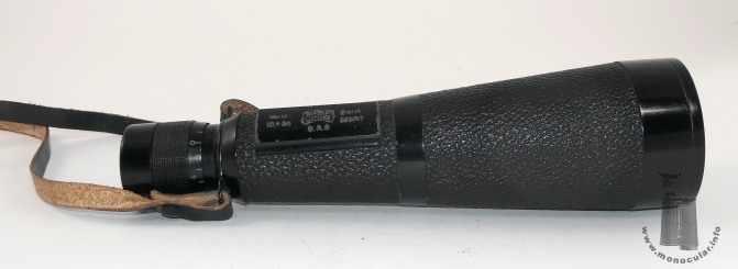 The 10x56 is 22-235mm long. It weighs 360g with its strap. The tube increases from 39mm to in diameter. The eyepiece is 30.5mm, the cross-knurled (+) focussing ring and the plastic eyecup are 35mm in diameter. The dioptre scale is marked at zero and und +/- five. The Dialyt was supplied with a fitting leather case. |