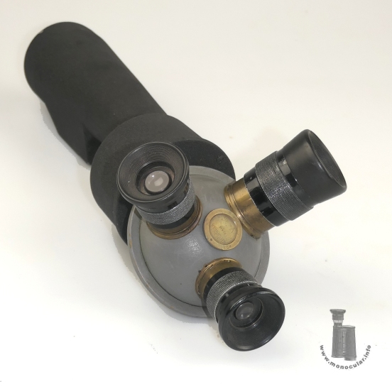 The Fournier Type V prism telescope has a three-magnification eyepiece turret: 14x, 21x, and 28x. The inscription disc in the center of the turret is engraved with the company logo "G. Fournier Paris V - 39" and the magnification settings near the eyepieces. The objective lens has a 50mm diameter. The eyepieces feature a full-circumference diopter scale, marked at zero and five at both plus and minus. The conical objective tube with its cast-in prism housing (Porro II prisms), the five-screwed housing cover, and the eyepiece tube are coated with an anthracite-coloured textured lacquer. The brass eyepiece turret is painted grey, the metal parts of the eyepieces are black, except for the once screw-secured eyepiece sleeves, which are unpainted. The objective tube uses a dovetail mount. The attachable sunshade is missing (cf. Pietrini: Le Grande Guerre des Jumelles, vol. II, p. 266) and there is no reticle. |