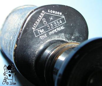 | Dieses 8x Monokular hat eine schlanke Bauform mit einem nierenförmigen Querschnitt des Gehäuses, das ein Porro-2-Prismensystem beinhaltet. Das Gehäuse ist aus Aluminium, oben bis auf einen Okularstutzen geschlossen und wird lediglich von einem Messingdeckel abgedeckt. Nach Abschrauben des Objektivtubus lässt sich der untere Deckel abnehmen und es werden 3 Schrauben sichtbar. Durch Lösen dieser kann die Grundplatte, auf dem das Porro-2-Prismensystem befestigt ist, herausgezogen werden. Dies ermöglicht eine einfache Reinigung oder Justierung. Die ganze Bauart und -form sieht nach einem Schütz-Glass aus und dürfte eine Fertigung für Aitchison oder deren Lizenzferrtigung gewesen sein; das Prismen-Logo auf dem oberen Deckel entspricht auch dem Schütz Logo und nicht damaligen Aitchison Kennzeichnungen. Im Logo befindet sich die Vergrößerungsangabe "8x" und darunter die Produktions- oder seriennummer "Nr. 30354" – man beachte auch hier die Abkürzung für Nummer in deutscher Art als "Nr." und nicht englisch als "No." An den Prismendächern des Logos steht "Aitchison" und "London", an der Basis "The Imperial". Für das gesagte spricht auch ein weiteres Exemplar mit Seriennummer 30220, welches mit "German" statt mit "The Imperial" beschriftet ist. | This 8x monocular has a slender housing with a kidney-shaped base, which contains a porro 2 system. The body is made of aluminium, and is closed at its top apart from an ocular barrel. The top is covered with a brass plate with some markings. When unscrewing the objective cover plate you can see three screws that hold the prism mounting rack inside. It can be pulled out easily for cleaning or adjusting the prisms. The whole design and construction looks like a porro 2 glass by Schuetz Cassel, and might just be a licence production by Aitchison or a make for Aitchison. Moreover, the prism logo at the top cover plate is the same as the Schütz logo of the 1920s and 30s. The magnification '8x' is given within the logo, below the serial or production number "Nr. 30354" – notice that the abbreviation for number is the German "Nr.", not the English "No.". "Aitchison" and "London" is inscribed along the prism sides of the logo, the base being marked with the model name "The Imperial". Another proof for the notes above comes with another 8x model (S/N 30220) that is marked with "German" instead of "The Imperial". |