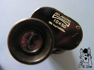 The Atlantis 10x50 monocular is a typical post-war porro 1 prism monocular made in Japan with coated optics. The "JB 24" maker's code says that this is a glass by Ichikawa Kogaku Kogyo Co. Ltd.,Tokyo. The upper cover is marked "ATLANTIS", then a logo showing a plain-concave lens and the specifications "10x50, 96.1 m/1000m"; the latter being the field ov view. The glass is covered with a textured hard rubber. It has a cast-in strap lug. The dioptre scale at the left-hand sided ocular ranges from +2 to -3. The eyecup is made of plastic. |