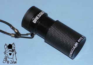 Bresser 5x12 Nahfokus-MonokularDieses 5x12 Dachkantprismen-Monokular mit einem eher seltenen Auszugstubus (vgl. moderne Zeiss-Monokulare) lässt sich für die Nähe auf 30cm scharf stellen. Es ist aus Metall mit Gummiummstnelungen udn einem roten Zierring am Objektivende. Die Augenmuschel ist aus Weichgummi. Die Vergütung ist blau. Es wurde mit einm farbigen Stoffetui geliefert. |