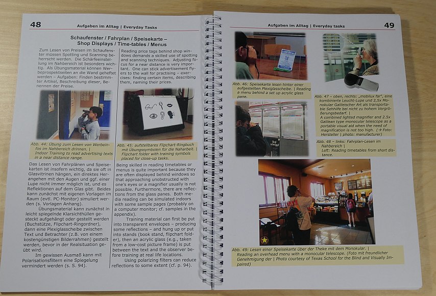 The book about "Monocular Telescope training" (2022/23) is now available in its 2nd updated and extended edition. It is written in German and English. The book is illustrated throughout in colour, comes with some appendixes with master copies usable for practicle training and checklists for a monocular assessment as well as for planning and checking the progress of the training steps and skills. The text is also available on the USB flash-card in its full scale, as screenreader accessible single language version as PDFs, adaptable copy material, further training material like animated and actual films, songs and accompanying stories (Telescope-Fox Stories by U. Zeun; Rabbit & Blixten Stories by Krister Inde from 2004). The 194 pages book is spiral-bound plus the data disk. All the materials serve as a guide to plan a training programme as needed when teaching students with low vision or when doing a orientationa and mobility training. 194 pages, spiral-bound, USB flash-card |