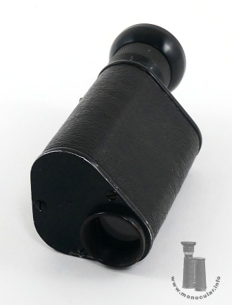 | Das "Lynkop" 12x mit 20er Objektiv ist ein Prisma-Monocle der Fa. E. Busch aus Rathenow vom Anfang des 20. Jh. - ca. 1903-1909. Das Gehäuse hat einen dreieckigen Grundriss mit abgerundeten Ecken, einer Lederummantelung mit Naht sowie angeschraubter Trageriemenöse. Das Monokular ist aus Aluminium, die Deckel sind dreifach verschraubt und schwarz lackiert. Der obere Deckel trägt die Firmenbezeichnung und den Modellnamen. Die Vergrößerung ist in die Seite der 3/3 Bakelitaugenmuschel eingraviert. Es gibt eine Dioptrienskala von plus bis minus Vier. | The "Lynkop" 12x with a 20mm aperture is a prism monocular by E. Busch Rathenow from the beginning of the 20th century - about 1903-1909. The housing has a triangular cross-section with rounded corners. The leather covering has a seam. There is a strap lug screwed to the aluminium body. The cover plates have three screws and are painted black. The top cover is marked with the maker's and the model name. The glass's magnification is engraved on the 3/3 Bakelite eyecup. The latter has a dioptre scale ranging from plus to minus four. |