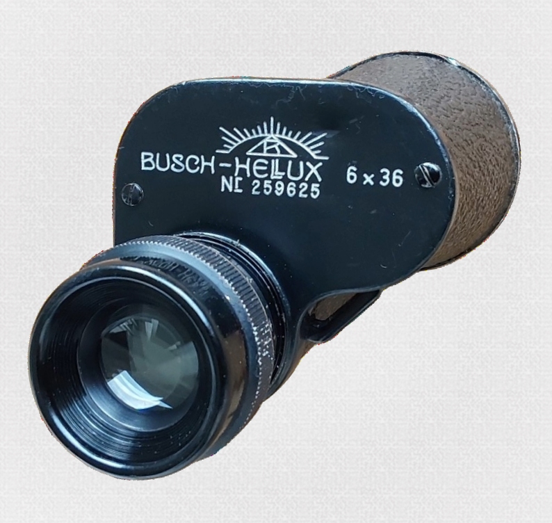 | Das 6x36 Modell aus der Busch "Hellux"-Serie ist ein 402g schweres Porro-1-Monokular mit einem dickwandigen lederummantelten Aluminiumgehäuse und den für Busch typischen Prismenklammern, die durch Schrauben von außen justierbar sind. Die Dioptrienskala am rechtsseitgem Okular reicht von plus bis minus Fünf, ist aber bei Null, Zwei und Vier beschriftet. die Augenmuschel ist aus Bakelit. Die Optik ist unvergütet. Die Baumerkmale und die Deckelbeschriftung nur mit "6x" unter dem Sonenstrahl-Logo mit R in einem Dreieck weisen auf die Baureihe vor dem 1. Weltkrieg um 1910 hin. |