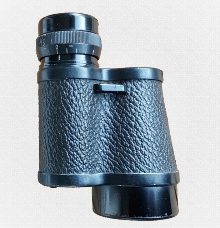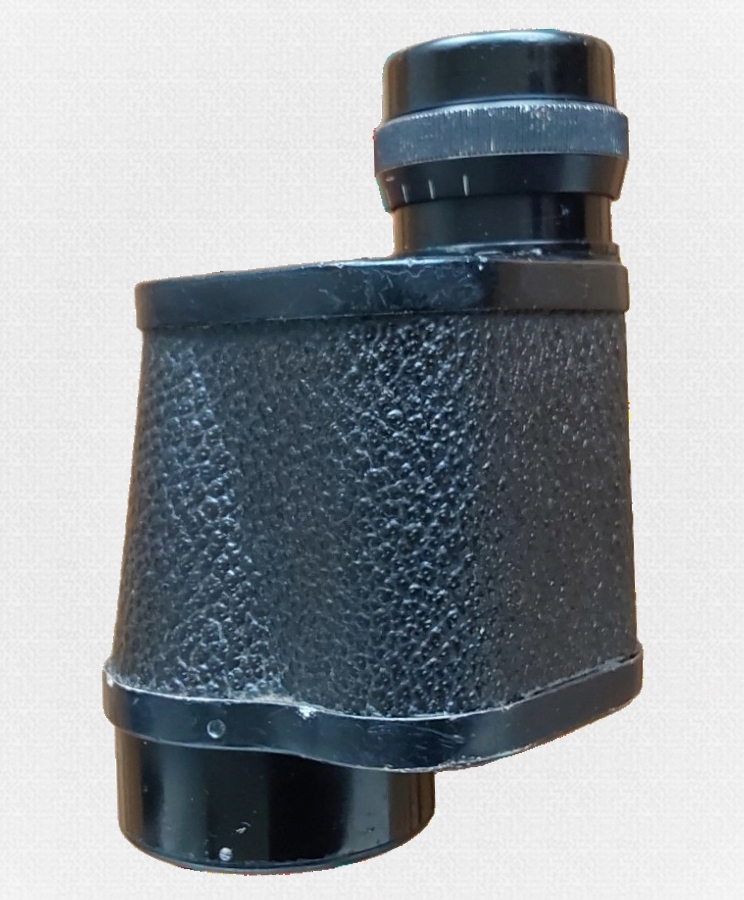 This 6x36 model from the Busch "Hellux" series is a rather heavy 402g porro 1 monocular with a thick walled aluminium housing having a leather covering. It has the prism clamps inside that can be adjusted by screws from the outside, a typical Busch feature. The dioptre scale at the right-hand sided ocular ranges from plus to minus five, being marked at zero, two and four. The eyecup is made of Bakelite. The optics are uncoated. The design characteristics and the markings with only "6x" below the sun-ray logo with an R inside a triangle hint at the model series before WW I. around 1910. |