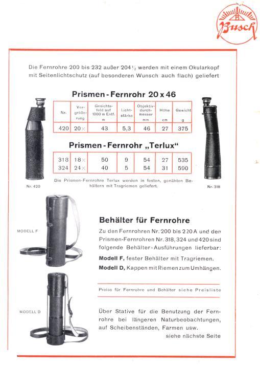 Busch Monokulare KatalogseitenIn einem Katalog aus dem 20er Jahren der Fa. Busch (Seite 3) finden sich drei monokulare Spektive, darunter das 20x46. Als Zubehör gab es Lederköcher oder Schutzkappen. |