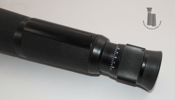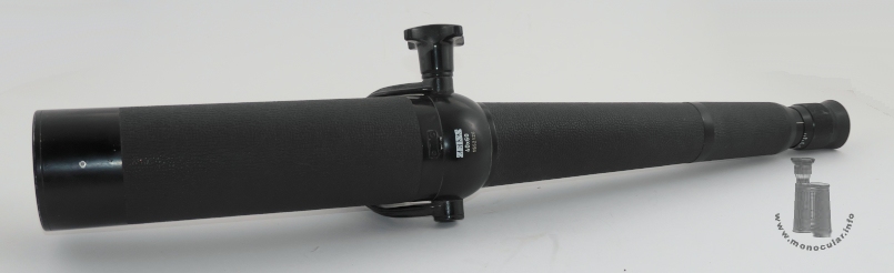 | Das Zeiss 40x60 in der Dialytbauweise mit Seriennummer 1552126 und 1552211 ist der Nachfolger des Hensoldt Dialyt 40x60. Alle Bau- und optischen Daten sind gleich, außer einem ca. 100g höherem Gewicht (1400g), einer umstülpbaren Gummiaugenmuschel, sowie einer Mattlackierung des Stativadapters und Kunststoff-überzogener Flügelschrauben zum Feststellen des Stativadapters. Das abgebildete monokulare Fernrohr wurde ab 1977 gebaut. | The Zeiss 40x60 (S/N 1552126 and 1552221) with a Dialyt construction represents the successor ot the Hensoldt Dialyt 40x60. All construction details and optical specifications are the same, escept a higher weight of 1400g, a foldable rubber eyecup, and matte paitned tripod adapter with winged screws, covered with plastic. The monocular spotting scope was made since 1977. |