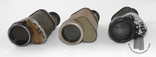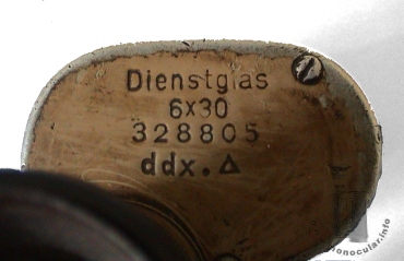 | Ein früheres Modell ohne Punkt hinter dem 'ddx' hat die Nummer "0471" und ein (blaues) Kreissymbol für das früher eingeführte, benutzte Kältefett 1416 (bis -40°). Das Aluminiummonokular wiegt nur 172g und ist grau-schwarz lackiert. Die Objektivringhülse ist 41mm im Durchmesser. Ein weiteres sandfarben ('Dunkelgelb nach Muster') lackiertes Exemplar mit Seriennummer 250553 weist nunmehr das Dreieckssymbol für das benutzte Kältefett auf und wiegt 194g. An der Okularlinse fehlt der Befestigungsring. | Another earlier model has number 0471 and is marked with a (blue) circle sign standing for the used cold-resitant lubricant 1416 (until -40°) introduced earlier . The aluminium monocular only weighs 172g, and is painted greyish-black. The objective sleeve is 41mm in diameter. Another sand coloured ('dark yellow after pattern') with the serial number 250553 meanwhile shows the triangle symbol for its used lubricant and weigh 194g. The retainer ring of the ocular lens is missing. |