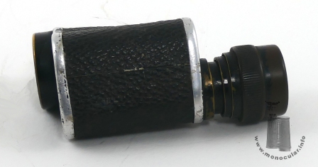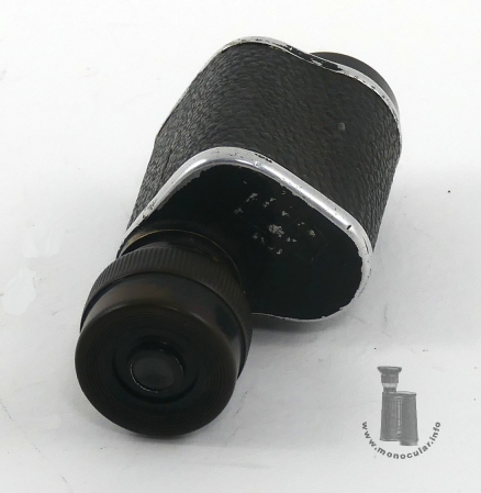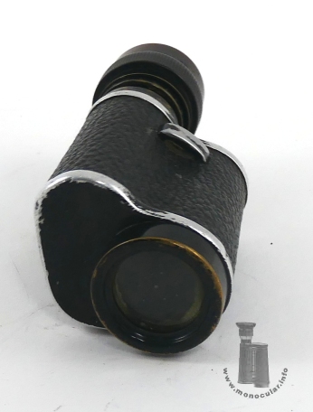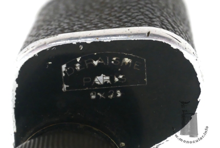 | Das Deraisme 8x25 Monokular ist mit dem Logo und 8x25 auf dem obeen schwarz lackierten Aluminiumdeckel beschriftet. Die Deckel haben keine Schrauben. Der obere Deckel wird jedoch mit einem Schraubring am Okularstück fesgezurrt. Die 2/3 Augenmuschel am linksseitigen Okularstück mit einer umlaufenden Dioptrienskala ist aus Kunststoff. Das Oularstück und die Objektivfassugn sind aus Messing. Wei bei an deren französischen Gläsern lässt sich das Okularlisnenhülse herausziehen, wenn man die augenmuschel abschruabt. Das Gehäuse ist mit strukturiertem Hartgummi ummantelt. Am Korpus ist eine gebogene Trageriemenöse eingegossen. | The Deraisme 8x25 monocular is marked with the company logo and 8x25 on the black painted top cover plate. The aluminium covers have no screws, but the top cover is fixed by a retainer ring on the eyepiece. The 2/3 eyecup on the left-hand sided eyepiece is made of plastic. The eyepiece and the objective frame are made of brass. The dioptre scale is running completely around the eyepiece. Like with other French made glasses you can pull out the ocular lens casing when screwing off the eyecup. The housing is covered with a textured hard rubber. There is a bowed cast-in strap-lug. |