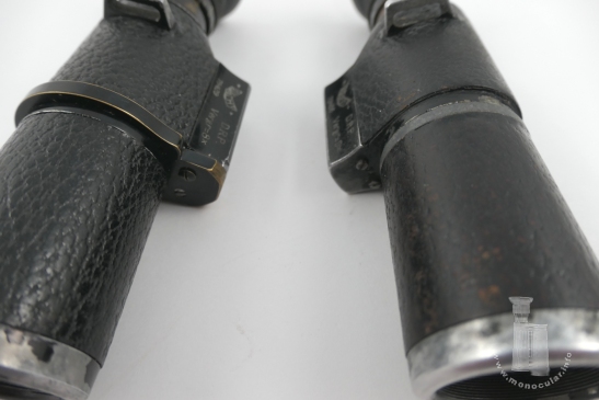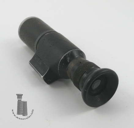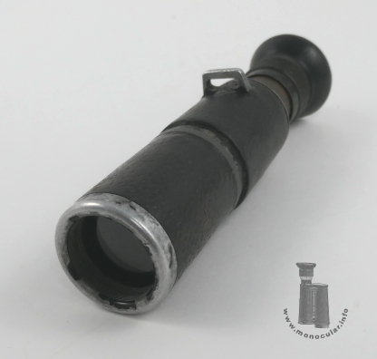 | Das vorliegende 8x26 Dialyt ist mit "Hensoldt Wetzlar" und dem Markennamen "Wacht" sowie "D.R.P. Vergr=8x" an den langen Außenseiten des Beschriftungssockels gekennzeichnet. Unter dem Logo steht die Seriennummer "78429". Die obere Sockelfläche ist unbeschriftet. Es hat ein Prismengehäuse mit eingegossener Trageriemenöse und dem vorstehenden Beschriftungssockel. Der Objektivtubus ist leicht konisch. Beide Tubusteile sind mit braunem Leder ummantelt. Ansonsten sind die Aluminium- und Messingteile sind schwarz lackiert. Das Messingokular hat eine umlaufende Dioptrienskala mit Beschriftungen bei null, +5 und -5. Die Augenmuschel ist aus Hartgummi. Ungewöhnlich ist ein zwischen Beschriftungssockel und Objektivtubus angebrachter Messingring. Da dieser Rillenspuren einer Abfeilung zeigt, könnte das Messingteil auch eine längere Halterung für ein anderes Instrument gewesen sein, die abgesägt wurde. Dafür spricht die Strichplatte mit Fadenkreuz. So könnte das Monokular als Visier oder Zieleinrichtung für ein Gewehr, Geschütz oder Peilgerät, wie einen Sextanten oder Theodoliten gedient haben. Ein anderes bekanntes Exemplar hat die Nummer 78449, was zumindest auf eine kleine - nicht öffentlich dokumentierte - Produktionsserie und bei Hensoldt gemachten Umbau dieser Art schließen lässt. Es entspricht ansonsten dem Reisedialyt 8x26. |