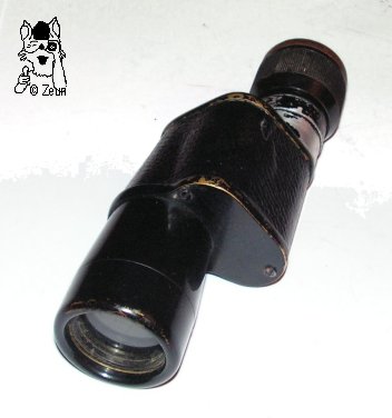 | In der Goerz Zweigstelle in Bratislava wurde dieses 8x30 Porro-1-Monokular gefertigt, welches für militärische Zwecke, Z.B. Peilgerät, Blinkgeät gedacht war. Es ist aus Messing und Aluminium mit einem recht dickem linksseitigem Weitwinkelokular konstruiert. Die braune Bakelitaugenmsuchel hat ein Messinggewinde und ist mit 9mm relativ flach, während der vertikal geriffelte Fokussierungsring mit 20mm recht breit ist. Die Dioptrienskala ist je Strich mit der entsprechenden Zahl beschriftet und reich von plus bis minus Fünf. Das Gehäuse ist mit Hartgummi beschichtet, der Objektivtubus nur schwarz lackiert. Der obere schwarz lackierte Deckel ist mit "K.P. Goerz" im Prismenlogo, darunter mit der Militärnummer 1233 beschriftet. Die optischen Daten für Vergrößerung und Sehfeld sind ebenfalls mit "8x 7°" angegeben. |