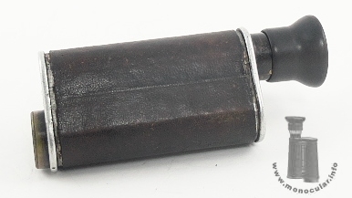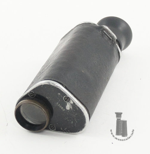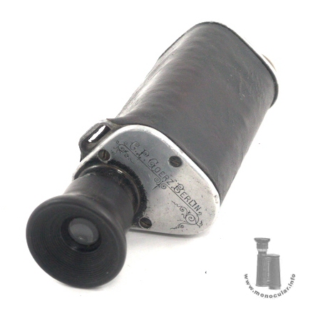 | Das abgebildete Monokular hat die Firmenbezeichnung "C. P. Goerz Berlin" in floraler Jugendstil-Schrift am oberen Deckel und die Seriennummer 53960 - 1903/04 - am unteren Deckel (beide 3fach verschraubt). Die Lederummantelung ist mit "12x" gestempelt, so dass es sich um ein 12x20 (tatsächlich 12x21) Glas handelt. Es wiegt 204g. Das Prismengehäuse ist 4,5 x 4,5 x 9,2cm groß bei einer Gesamtlänge von ca. 126 - 134 mm. Das Gehäuse ist dreieckig geschnitten, hat eine eingegossene Riemenöse und eine Bakelitaugenmuschel mit unbeschriftete Dioptrienskala (+/-2). Ein weiteres Exemplar mit Seriennummer 143602 - ca. 1908 - und Druckschrift am oberen Deckel hat nunmehr Messingdeckel und wiegt 252g. Der zugehörige Köcher trägt die Initialien eines britischen Offiziers ("Capt. A.J.H. Iles B.A.M.C."). |