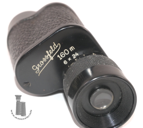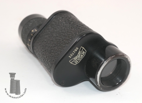 The "Grossfeld" (wide field of view) 6x24 model was made by Hensoldt since about 1928 until c.1940. The top cover plate states a field of view of 160m. Hence it is the second variant since 1933 with a slightly wider f.o.v. of 160 than before (150).This 6x24 was made between 1933 and 1936. The bottom cover bears the company logo and the serial number 351721. Both cover plates are fixed with only one screw. The 6x24 is a typical Porro I prism monocular with an Ebonite covering, black painted parts, and an eyepiece with a dioptre adjustment marked at 0 and +/-5, and a plastic eyecup. There is a cast-in strap lug. The 6x24 weighs 167g and it is 103-113mm long. The objective frame measures 34mm, the right-hand sided eyepiece 30.5mm, the corss-knurled focusing part 35mm, and the eyecup 34mm in diameter. |