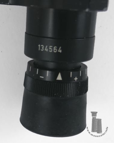 | Dieses Monokular in einer Montagefassung ist wohl identisch zum Zeiss (Oberkochen) 6x20B mit Gummiaugenmuschel. Es wurde von Hensoldt Wetzlar (Zeiss-Gruppe, Militärproduktion ab 1960er bis ca. 2000er) für Heckler & Kcoh (HK) gebaut. Das Kürzel HK ist am Tubus eingraviert, das Hensoldt Wtzlar-Prismenlogo und die Seriennummer 134564 befindet sich an Haupttubus angeschraubten Metallring. Das Monokular hat ein Schmidt-Pechan-Prsimensytem und eine blau-violette Vergütung. Es hat eine zurückklappbare Gummi-Aguenmuschel und einen Dioptrienausgleich von plus bis minus 3, der nur mit + und - sowei einem Dreicek für die Nullstellung markiert ist. Die Seriennummer ist 134564; ein weiteres Exemplar ohne Montierungsfassung hat die Nummer 134712. Vermutlich wurde das Monokular als Zielfernrohr, Ziellinien- oder anderes Prüfgerät gefertigt, worauf auch die Fadenkreuz-Strichplatte hinweist.. |