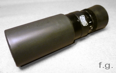 This monocular in a mount frame is likely identical to the Zeiss (Oberkochen) 6x20B with a rubber eyecup. It was built by Hensoldt Wetzlar (Zeiss Group, military production from the 1960s to approximately 2000s) for Heckler & Koch (HK). The initials HK are engraved on the tube, and the Hensoldt Wetzlar prism logo and the serial number 134564 are located on the metal ring screwed onto the main tube. Die Montagefassung trägt die Nummer 1240-12-306-0286 und hat eine Federarretierung. The monocular has a Schmidt-Pechan prism system and a blue-violet coating. It has a fold-back rubber eyecup and a diopter adjustment from plus to minus 3, marked only with + and -, as well as a triangle for the zero setting. The serial number is 134564; Another example without a mount has the number 134712. The mount comes with number 1240-12-306-0286 and a spring lock. The monocular was probably manufactured as a riflescope, sighting device, or other testing device which is also indicated by having a cross-wires reticle. |