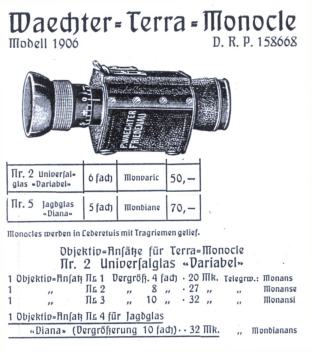 Monokulare mit Wechsel-VergrößerungOffensichtlich gab es den Wunsch unterschiedliche Vergrößerungen für verschiedene Sehsituationen an einem Fernglas zu haben; dies gab es auch schon bei Galileischen Gläsern. So entwickelte Carl Zeiss das "Marineglas 5x & 10x" mit einem Okularrevolver und bei Paul Waechter (Berlin) gab es 'Monocles' mit austauschbaren Objektiven (5x, 10x u. 4x 6x 8x 10x). |