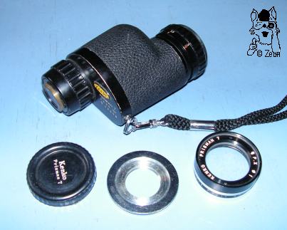 | Von der japanischen Firma Kenko stammt dieses 7x35 Prismenmonokular in Bausch & Lomb-Bauweise. Der obere Deckel ist mit einem erhabenem und gelb gefüllten Oval und dem Firmennamen "Kenko" beschriftet, darunter steht "Prisman 7", "7x35 10°", ein japanisches Zeichen und Nummer 38898. Der Deckelrand hat eine drehbare Trageöse, in die mit einem Karabinerhaken eine Handschlaufe eingehakt ist. Der Aluminiumdeckel, Okular- und Objektivteile sind schwarz lackiert, das Gehäuse hat eine anthrazit-farbene strukturierte Oberfläche. Die Linsen haben eine leicht gelbliche Vergütung. Da das Prisman 7 zur Verwendung als Teleobjektiv mit einer Kamera gedacht ist, kann das Kunststoff-Okular soweit herunter gedereht werden bis ein 26mm Gewinde für einen Kamera-Adapterring freigelegt ist. Der vorhandene Adapterring hat ein Außengewinde für ein 52mm-Objektiv der Kamera. Das Monokular wird an der Objektivseite fokussiert. Dafür ist eine Skala von 2,1m bzw. 7 Fuß bis unendlich gekennzeichnet. Ein weiterer Zwischenring mit silberem Zierring ist mit "Japan Wide Angle Exiit Pupil 5mm" beschriftet, wobei die Angabe der Austrittspupille mit den Werten 7x Vergrößerung und 35mm Objektiv korrespondiert. Wiederum daran kann ein Makrolinse (bläuliche Vergütung) aufgeschraubt werden, die den Schärfebereich bis auf 50cm reduziert. Sie ist mit "Kenko Prisman 7 (japanisches Zeichen) P.X #1" markiert. | The Japnes maker Kenko produced this 7x35 prism monocular with B&L design. The top cover plate is marked with an yellow oval with maker'S name, below "Prisman 7", then "7x35 10°", a Japanes sign, and finally number 38898. The cover rim is supplied with a turnable strap lug. A carabiner hooks a hand strap to it. All metal parts are lacquered black. The housing has a textured anthracite finish. The lenses have a faint yellow coating. As the Prisman 7 is intended also as a photo-telelens, you can turn down the ocular until a thread for screwing on an 26mm camera adapter ring is usable. The adapter rin has a 52mm thread for the camera objective. The monocular focuses a the objective end. So, this focusing part is marked with a meter and feet scale starting at 2.1m/7 ft. and stopping and infinity. At the objective thread a further intermediate ring with a silver band can be screwed in. It is marked "Japan Wide Angle Exiit Pupil 5mm". The exit pupil data corresponds with the 7 times power and 35mm objective diameter. Finally a macro lens (blue coating) can be fitted to the intermediate ring, thus achieving a near focus distance of 50cm. The lens is marked "Kenko Prisman 7 (Japanese sign) P.X #1". |