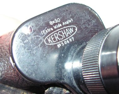 | Hier ist ein weiteres 8x30 Porro-1-Monokular von Kershaw aus der 2. Hälfte des 20. Jh. Das Gehäuse hat eine strukturierte Kunststoffummantelung mit Trageriemenöse, schwarz lackierte Aluminiumteile und eine Plastikaugenmuschel. Die Optik ist blau vergütet. Die Deckel sind einfach verschraubt, der obere ist mit dem Kershaw-Logo sowie "8x30 extra wide angle" und der Seriennummer "No. 50697" bzw. "50694" beschriftet. Die Dioptrienskala am rechtsseitigen Okular ist komplett umlaufend und von + bis - 5 markiert. Der passende Lederköcher ist mit violetten samt ausgefüttert und trägt im Deckel das Kershaw-Emblem in Gold. | Here we have another 8x30 porro 1 monocular by Kershaw dating from the second half of the 20th century. The housing has a strutured plastic covering with a cast-in strap lug. It has black lacqueredd aluminium cover plates and a plastic eyecup. Optics are coated blue. The covers have one screw, the upper one having the Kershaw logo, and being marked "8x30 Extra wide angle", also marked with serial number "No. 50697"; another marked "50694". The dioptre scale at the right-hand sided ocular runs fully around it and ranges from + to -5. The matching leather case is cushioned with violet velvet, and the inside of the lid stamped with the logo in gold. |