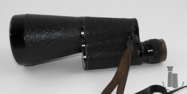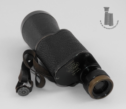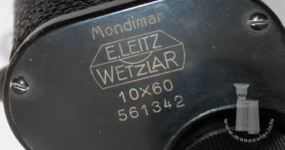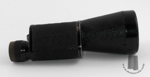 The Mondimar Monocular made by Leitz was produced between 1937 and 1959 with the following specifications: 10x60, f.o.v. 5.8° . The model in the picture has S/N 561342 (uncoated). Both covers have two screws. The bottom cover is also marked "Germany". Another "Mondimar" with left-hand sided eyepiece has the serial number 506941 (514634 coated). Model no. 561349 comes with a tripod thread attached some time after production. The eyecup is made of plastic. The right-hand sided ocular has a +/-5 dioptre adjustment with a scale running completely around the eyepiece. The refernce line is marked at the rim of the top cover. The prism housing and the conical objective tube have some textured fake leather covering. |