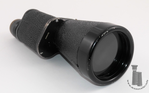 | Das Mondimar Monokular von Leitz mit den Werten 10x60 und einem Sehfeld von 5.8° wurde zwischen 1937-1959 hergestellt. Das abgebildete Modell hat die Seriennummer 561342 (unvergütet). Beide Deckel sind zweifach verschraubt; der untere ist auch mit "Germany" beschriftet. Ein weiteres "Mondimar" mit linksseitigem Okular hat die Seriennummer 506941 (514634 vergütet). Das Modell mit Nr. 561349 hat ein nachträglich angebautes Stativgewinde. Die Augenmuschel ist aus Kunststoff, das rechtseitige Okular hat einen Dioptrienausgleich von + bis - 5 auf einer umlaufenden Strichskala. Der Referenzstrich ist am seitlichen Deckelrand eingezeichnet. Das Prismengehäuse und der konische Objektivtubus sind mit einem strukturierten Kunstleder ummantelt. |