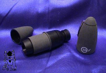 another penscope with 6x telescope and 30x microscope is the Soligor. The slim magnifying lens with its acryl stand is slipped onto the objective to get a microscope. focusing is done by turning the two tubes. The objective diameter is 10mm, the monocular is 135mm in length and weighs 62g without and 72 with the macro lens. |