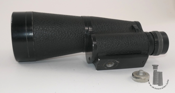 Das 15x60 Monokular oder Kleinspektiv ist ein Porro-I-Modell mit einer Adapterplatte mit Stativgewinde an Brückenansätzen angeschraubt, einer eingegossen Trageriemenöse am Gehäuse sowie einem konischen Objektivtubus. Das rechtsseitige Okularstück hat eine Dioptrienskla von +9 bis - 7 mit Beschriftungen bei null und 5 und einem Referenzstrich am Deckelrand. Der Fokussierungsring hat eine senkrechte Riffelung (|||), die Augenmuschel ist aus Plastik. Der untere Deckel ist einfach, der obere zweifach verschraubt und mit dem Beck Kassel CBS Logo sowie den Werten beschriftet. Die Optik ist bläulich-lila vergütet. Die Deckel sind schwarz lackiert, das Gehäuse und der Objektivtubus mit einem anthrazit-farbenen Hartgummi ummantelt. | The 15x60 monocular or small spotting scope is a Porro I model with an adapter plate with a tripod thread screwed onto the bridge lugs. There is a cast-in strap lug on the body, and a conical lens barrel. The right-hand eyepiece has a diopter scale from +9 to -7 with markings at zero and 5 and a reference line on the rim of the cover. The focusing ring has vertical knurling (|||), and the eyecup is made of plastic. The lower cover is single-screwed, the upper cap double-screwed, and is labeled with the Beck Kassel CBS logo and its values. The optics are bluish-purple coated. The caps are painted black, and the body and objective barrel are covered with anthracite-coloured hard rubber. |