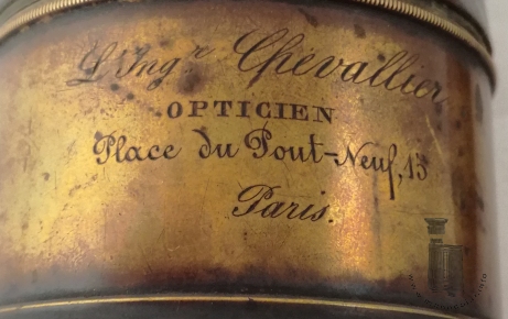 Chevallier 4x56 Galilean GlassThe Galilean telescope or binoculars shown here are made of brass with a stitched dark brown leather covering on the bell-shaped main tube. It features one draw with a slider to protect the eyepiece lens. Above the straight objective lens mount is a retractable sun-shade engraved with "L'ingr. Chevallier OPTCIEN Place du Pont-Neuf, 15 Paris" in floral script. A protective cap can be attached to the sun-shade. The protective cap and the main tube have eyelets for attaching a strap. |