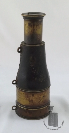 Das Galileische Monokular wiegt 470g. Es ist 142-182mm lang; die Sonnenblende lässt sich bis zu 35mm ausziehen. Die Metallaugenmuschel ist 47,7mm, der Auszugstubs 38mm, der konische Tubus 44-64 mm und der gerade Objektivtubus 61mm im Durchmesser. Die 55mm lange Sonnenblende ist 65mm, die Schutzkappe 67mm im Durchmesser. Ein weiteres Exemplar ohne Belderung ist bekannt (s. letztes Foto). |