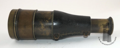 The Galilean monocular weighs 470g. It is 142-182mm long; the lens hood extends up to 35mm. The metal eyecup measures 47.7mm, the extension tube measures 38mm, the conical lens barrel measures 44-64mm, and the straight objective barrel measures 61mm in diameter. The 55mm-long sun-shade is 65mm, and the lens cap is 67mm in diameter. Another specimen without leather covering is known (cf. last photo). |