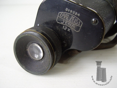 | Das Zeiss Teleduzmo 12x40 hat wie das 16x40 Modell einen langen konischen Objektivtubus und eine flache Augenmuschel. Die Seriennummer 319224 lässt es auf 1913 datieren. Es liegt in der bislang einzig bekannten Serie von 100 Stück (Nr. 319201-319300). Das linksseitige Okular hat eine umlaufende Dioptrienskala bis +/-10. Die dreifach verschraubten Messing-Deckel und anderen Metallteile sind schwarz lackiert. Das Gehäuse ist mit einem dunkelbraunen Rauhlack ummantelt und hat eine eingegossene Trageriemenöse. Die Augenmuschel ist Bakelit. Die Beschriftung am oberen Deckels hat die Seriennummer, das Zeiss-Linsenlogo und darunter "12x". Das Sehfeld liegt bei 61 m auf 1000m. |