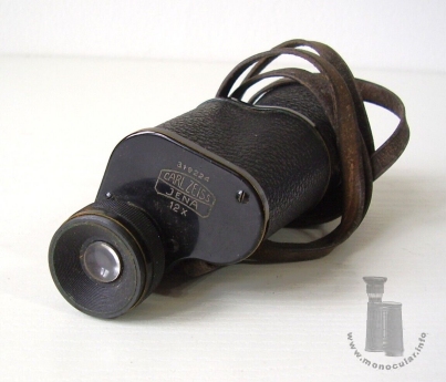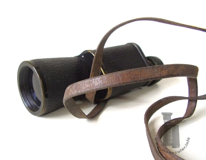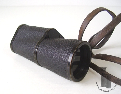 This Zeiss Teleduzmo 12x40 model has a longer conical tube and a shallow eyecup like the 16x40 model. The serial number 319224 dates it to 1913. It is one of the until now only known batch of 100 pieces (Nr. 319201-319300). The left-hand sided eyepeice has a dioptre scale running fully around the tube, ranging from + to - 10. The brass cover plates have threee screws and are painted black liek all other metal parts. The housing is coered with a dark brown Ebonite. It has a cast-in strap lug. The eyecup is made of Bakelite. The inscriptions on the top cover has the serail number, the Zeiss lens logo, and finally below this "12x". Its field of view is 61 yds at 1000 yds. |