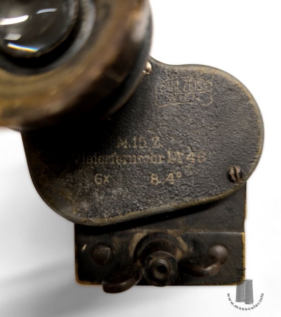 Here is a rare monocular version of the D.F. 6x42 from Zeiss, which was made in the Vienna branch as a military sight for use with another device, such as a rangefinder or flak. In addition to the Carl Zeiss Vienna lens logo, the upper cover plate is amrkede with "M.15.Z. Visierfernrohr no.48" (telescopic sight) and the data 6x and 8.4 °; the lower cover plate bears the acceptance stamp "UK 20.12.1917", which clearly denotes it as glass from WWI. The telescopic sight is made of aluminum with an anthracite-colored paint on the body and a hard rubber eyecup. There is a mounting foot with fastening grooves and a wing screw. A red glass window and attachment for a lighting unit is to the right of the eyepiece. the reticle has a crosshair. The optics are uncoated. |