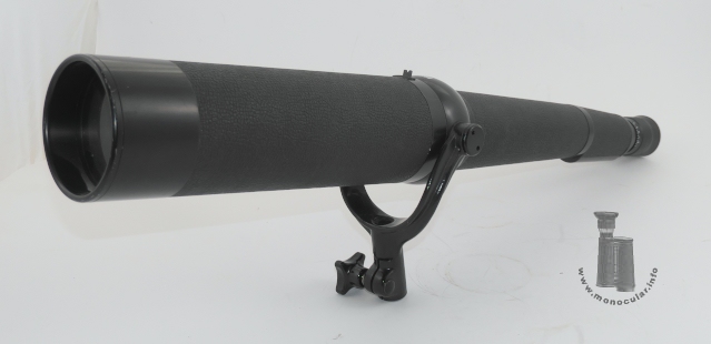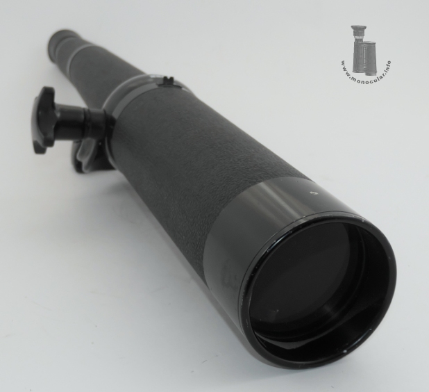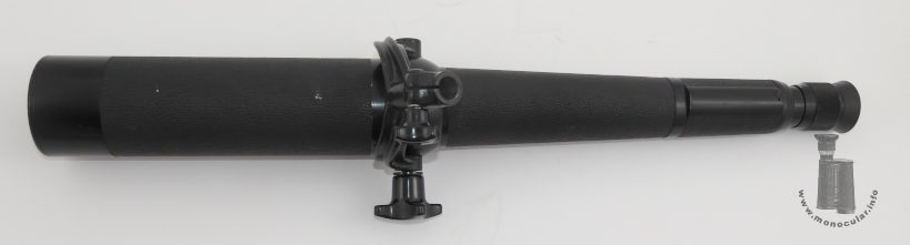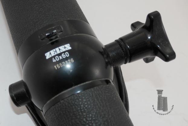 | Das Zeiss 40x60 in der Dialytbauweise mit Seriennummer 1552126 und 1552211 ist der Nachfolger des Hensoldt Dialyt 40x60. Alle Bau- und optischen Daten sind gleich, außer einem ca. 100g höherem Gewicht (1400g), einer umstülpbaren Gummiaugenmuschel, sowie einer Mattlackierung des Stativadapters und Kunststoff-überzogener Flügelschrauben zum Feststellen des Stativadapters. Das abgebildete monokulare Fernrohr wurde ab 1977 gebaut. | The Zeiss 40x60 (S/N 1552126 and 1552221) with a Dialyt construction represents the successor ot the Hensoldt Dialyt 40x60. All construction details and optical specifications are the same, escept a higher weight of 1400g, a foldable rubber eyecup, and matte paitned tripod adapter with winged screws, covered with plastic. The monocular spotting scope was made since 1977. |