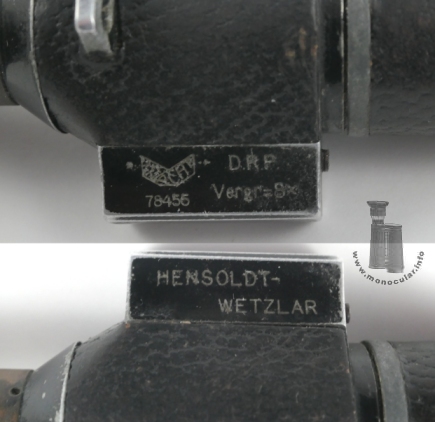 | Das vorliegende 8x26 Dialyt ist mit "Hensoldt Wetzlar" und dem Markennamen "Wacht" sowie "D.R.P. Vergr=8x" an den langen Außenseiten des Beschriftungssockels gekennzeichnet. Unter dem Logo steht die Seriennummer "78429". Die obere Sockelfläche ist unbeschriftet. Es hat ein Prismengehäuse mit eingegossener Trageriemenöse und dem vorstehenden Beschriftungssockel. Der Objektivtubus ist leicht konisch. Beide Tubusteile sind mit braunem Leder ummantelt. Ansonsten sind die Aluminium- und Messingteile sind schwarz lackiert. Das Messingokular hat eine umlaufende Dioptrienskala mit Beschriftungen bei null, +5 und -5. Die Augenmuschel ist aus Hartgummi. Ungewöhnlich ist ein zwischen Beschriftungssockel und Objektivtubus angebrachter Messingring. Da dieser Rillenspuren einer Abfeilung zeigt, könnte das Messingteil auch eine längere Halterung für ein anderes Instrument gewesen sein, die abgesägt wurde. Dafür spricht die Strichplatte mit Fadenkreuz. So könnte das Monokular als Visier oder Zieleinrichtung für ein Gewehr, Geschütz oder Peilgerät, wie einen Sextanten oder Theodoliten gedient haben. Ein anderes bekanntes Exemplar hat die Nummer 78449, was zumindest auf eine kleine - nicht öffentlich dokumentierte - Produktionsserie und bei Hensoldt gemachten Umbau dieser Art schließen lässt. Es entspricht ansonsten dem Reisedialyt 8x26. |