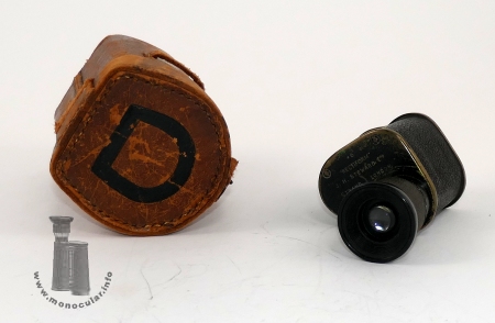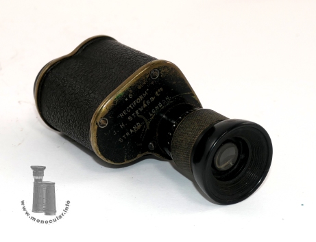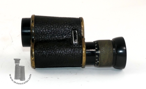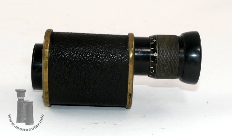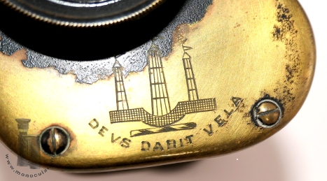 Das Monokular mit der Modellbezeichnung "x6 Rectiform" vom Londoner Hersteller "J.H. Steward Ltd Strand London" (Beschriftung am oberen Deckel) wird wohl vor oder um den 1. Weltkrieg herum hergestellt worden sein. Die optischen Werte sind 6x23. Der Lederköcher ist am oberen Deckel mit einem großen "D" gestempelt. Der untere blanke Messingdeckel, der einst auch schwaz lackiert war, ist mit einem Seefahrer-Emblem (der Master Mariners) gekennzeichnet. Dieses zeigt 3 Masten oder Türme oben jeweils mit einer Fahne, wobei die Masten auf einer in der Mitte gebogenenn Plattform stehen, diese wiederum befindet sich auf einem Balken mit angedeuter Gischt. Darunter ist der Leitspruch "DEUS DABIT VELA" = "Gott gibt Segel" oder "Wind" eingraviert. Das Monokulargehäuse mit einer Raulackummantelung ist aus Aluminium, die andern Metallteile sidn aus Messing. Die Augenmuschel ist aus Hartgummi. Die Optik ist unvergütet. Das rechtsseitige Okular hat eine umlaufende Dioptrienskala mit Ziffern bei null und +/- 5. |