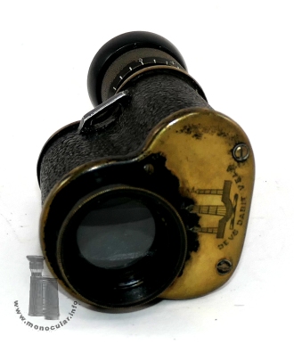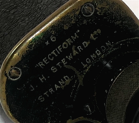 The monocular with the model name "x6 Rectiform" was made by the London-based manufacturer "J.H. Steward Ltd Strand London" (as marked on the upper cover) and was likely manufactured before or around World War I. The optical power is 6x23. The leather case is stamped with a large "D" on the upper lid. The lower, polished brass cover plate, which was also once painted black, is marked with a nautical emblem (of the Master Mariners). This depicts three masts or towers, each with a flag at the top. The masts stand on a platform curved in the center, which in turn rests on a beam with a hint of sea spray. Below it is engraved the motto "DEUS DABIT VELA" = "God gives sail" or "wind." The monocular body with a rough lacquer coating is made of aluminum, the other metal parts are made of brass. The eyecup is made of hard rubber. The optics are uncoated. The right-hand sided eyepiece has a circumferential diopter scale with numbers at zero and +/- 5. |