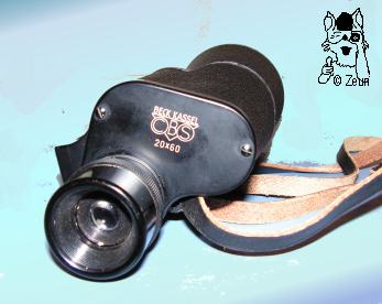 Das 20x60 Monokular von CBS Beck Kassel (s. oberer Deckel) hat eine magenta Vergütung, eine Strukturlackummantelung und einl inksseitiges Okular mit hohen Dioptrienausgleich von +10 bis -7. Die Augenmuschel ist aus Plastik, die Metallteile schwarz lackiert. An der Gehäuseseite, wo beim Binokular die Brücke angebracht ist, befindet sich ein Stativgewindeplatte. The 20x60 monocular by CBS Beck Kassel Germany (s. top cover) is coated magenta. It is covered with some textured paint, whereas the metal parts are lacquered black. The left-hand sided eyepiece has a plastic eyecup and a wide dioptre range between +10 and -7. There is a plate with a tripod thread attached to the side where usually the binoculars bridge is.