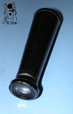 Blechteleskop mit 1 AuszugDieses kleine Blechteleskop nach galileischem Prinzip hat einen Auszug, eine Schrumpflackummantelung am konischen Haupttubus und bei einem 30mm Objektiv ca, eine 2,5fache Vergrößerung. |