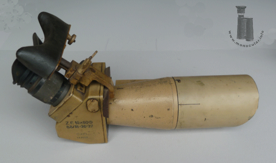 | Die monokulare Variante des bekannten Doppelfernrohrs 10x80 mit 45° Einblick als Flak-Fernrohr wurde von E. Busch in Rathenow gefertigt. Die bekannten Exemplare tragen den cxn Herstellercode aus dem 2. Weltkrieg. Die seitlich am Prismengehäuse angebrachte Beschriftung lautet "Z.F. 10x80 (1)", darunter "8,8/18-36-37" und unter dem Code die Seriennummern (hier: 123656, 123870, 124083, ferner: 123622,123796). Die Bezeichnung mit Z.F. für Zielfernrohr weisen ein orignäres Monokular aus. Es wurde wohl an der 8,8cm FlaK (Modelle 18, 36 u. 37) verwendet (s. Bezeichnung). Das Z.F. 10x80 hat eine Gummiaugenmuschel, ggf. eine Stirnstütze mit zweitem Blindokular, eine Filtereinstellung (klar + Filter), ein Beleuchtungsfenster für die Strichplatte sowie ein abnehmbares Regenshcutz- oder Sonnenblendrohr. Bei einem Exemplar im Artikel von A. Vacani sieht man auch ein angeschraubtes Hilfsvisier. Auf der linken Gehäuseseite befinden sich Montageschrauben. Die meisten Fernrohre scheinen sandfarben lackiert (oder zum. grundiert) gewesen zu sein. |