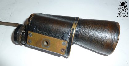 | Dieses Zeiss 16x40 Modell mit Bestellwort "Telextinmo" ist aufgrund der Seriennummer 298465 ein Exemplar aus dem ersten Produktionsjahr 1912. Es ist durch eine handliche Bauweise mit einem verlängerten konischen Objektivtubus und einem kurzem Okularstück (linkseitigem) mit flacher Augenmuschel charakterisisert. Auch die Markierungen bei +10 und -10 neben den üblichen + und -5 sind ein besonderes Merkmal. Die dreifach verschraubten Deckel und Metallteile sind schwarz lackiert. Das Gehäuse ist mit einem dunkelbraunen Rauhlack ummantelt. Die Augenmuschel war aus Bakelit, ist aber nicht mehr vorhanden, sondern wurde durch einen Hartgummi- oder Kunstharznachbau ersetzt. | This Zeiss 16x40 model called "Telextinmo" is from teh first series of 1912, having the serial number 298465. Its cosntruction is quite handy featuring a slender conical objective tube and a short ocular with a flat eyecup. The dioptre division lines are also marked at +10 and -10 which is unusual compared to common +/-5 markings. The cover plates ahve three screws and are painted black. The same applies to other metal parts. The housing is covered with a dark brown rough paint. The original eyecup must have been made of Bakelite, is missing now, and was replaced with a reproduction. |