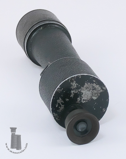 | Das Carl Zeiss Jena "Tersexmo" wurde nur kurz vor dem 1. Weltkrieg mit Porro-1-Prismen gebaut (s. Foto innen). Es ist mit seinen Kennwerten von 18x50 der Vorläufer des späteren Nachkriegsmodells "Delfortmo" 18x50, jedoch mit einem längeren runden Prismengehäuse und einer am Gehäuseboden angeschraubten Trageriemenöse, wobei ersteres wiederum eher dem Gehäuse des "Noctar 7x50" ähnelt. Der obere dreifach verschraubte Deckel ist mit dem Zeiss-Linsenlogo und 18x sowie der Seriennummer 238005 beschriftet. Es dürfte daher in 1911 , bereits vor dem binokularen Tersex-Modell gefertigt worden sein (s. Foto vergleich Monokular und Binokular), ggf. als Versuchsmodell (vgl. a. Seeger, 2010, S. 649; Zeun 2013, S. 106). Am breiten Ende des konischen Objektivtubus ist ein gerader Objektiv-Linsentubus mit ausziehbarerer Sonnenblende. Am Metallring dieses geraden Tubusses wurde ein Metallstück eingelötet, wo bei einem Fernglas der untere Brückenarm ansetzt. Insofern könnte die Gußform von oder in Richtung einer Fernglasgußform sein, die für das monokulare "Versuchsmodell" bearbeitet wurde. Am Prismengehäuse lassen sich jedoch keine Spuren eines Brückenansatzes finden. Das Monokular würde der linken Hälfte entsprechen. Das 18x ist aus Aluminium, die Trageriemenöse aus Messing und die Augenmuschel aus Kunststoff. Prismendose, Objektivtubus und Sonnenblende sind mit Hartgummi ummantelt, die anderen Teile schwarz lackiert. Die komplett umlaufende Dioptrienskala ist bei Null und +/-5 markiert. | The Carl Zeiss Jena "Tersexmo" was made shortly before WWI and had Porro I prisms built in (s. Foto innen). Having the specifications of 18x50 it is the forerunner of th elater post-war model "Delfortmo" 18x50, but comes with a longer round prism housing and with a strap lug attached to the bottom of the housing. Yet, the housing resembles more the desing of the "Noctar 7x50". The top cover palte has three screws and is inscribed witht he Zeiss lens logo and "18x" as well as the erial nubmer 238005. Hence, it was probably made in 1911 even before the binocular Tersex models (cf. photo comparing monocular and binocular), probably as a test model (cf. also Seeger, 2010, p. 649; Zeun 2013, p. 106). At the thicker end of the conical tube is a straight objective lens frame witha n extendable ray-shade. There is a small metal piece welded into a recession of the thicker metal ring where there would be the lwoer bridge arm of the binocular version. Insofar this also might be a half of the binocular mould or a approximate mould for the binocular which was machined for the monocular test model. No traces of a bridge can be found on the prism housing, though. The monocular corresponds to the left half of a Tersex binocualr. The 18x is made of aluminium, the strap lug made of brass and the eyecup made of Bakelite or hard rubber. The prism box, the objective tube and the ray-shade are covered with Ebonite, the other parts are lacquered black. The dioptre scale running fully around is marked at zero and +/-5. |