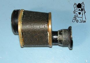 This Carl Zeiss Jena 4x20 monocular is only marked "4x" below the logo, thus hinting at a production time before or during WWI. Also serial number 734053 dates at year 1916 for production. There are some specialities of this version. Number "62" is marked on the top cover plate, the body has a anthracite rough textured surface, all parts have some sealing grease, and there is an additonally fitted larger objective ring with an inner thread. All these feature hint at a military use. With the objective thread (three seprate parts and blank interspaces) the 4x20 could probably be mounted onto another device like a signaling apparatus or a gun for targeting. The number 62 corresponds to a certain military device or a serie number for a device. The objective frame is marked with a plus sign at its side (an adjustment sign or a later denotation of the cold-resistant grease?). There also is military number 239284 stamped into the rim of the lower cover plate, a further proof of the monocular's military use. The eyecup os made of Bakelite. The left-hand sided eyepiece comes with the usual +/-5 dioptre adjustment. The brass covers are painted black. There is no strap lug. |
