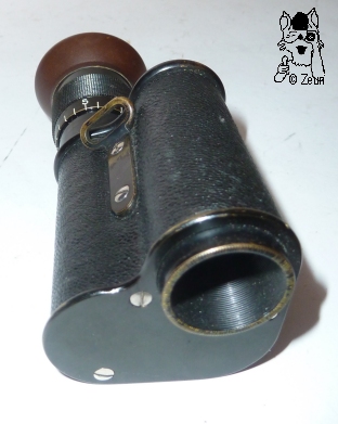 | Das 6x18 Modell ist mit "6FACH" unter dem Zeiss Linsenlogo beschriftet. Es hat die Seriennummer 334 (weiteres Modell #299) auf dem Deckel am Rand des Okularstück eingraviert. Es wurde zwischen 1904 bis ca. 1906 mit dieser Beschriftung produziert. Es hat dreifach verschraubte schwarz lackierte Deckel und eine Lederummantelung am Gehäuse. Die halblange Trageriemenöse ist mit zwei Schrauben angeschraubt. Die Dioptrienskala ist komplett umlaufennd und bei +5, 0 und -5 markiert. Die Augenmuschel ist aus Kunststoff. Die Objektivlinse ist um 14mm in das Gehäuse zurück versetzt. die Objektivfassung ist innen gerillt und bietet so einen Blendschutz. | The 6x18 model is marked "6FACH" below the Zeiss lens logo. It has the serial number 334 (other model #299) which is stamped on the top cover near the eyepice. It was made between 1904 and c. 1906 with this inscription. It has black painted cover plates with three screws, and a leather covering on the housing. The halfwaay long strap lug is fixed to the body with two screws. The dioptre scale runs fully round the ocular tube and marked +5, 0 and -5. The eyecup is made of plastic. TRhe objective lens is retracted by 14mm into the housing, its frame being grooved, thus building a rayshade. |