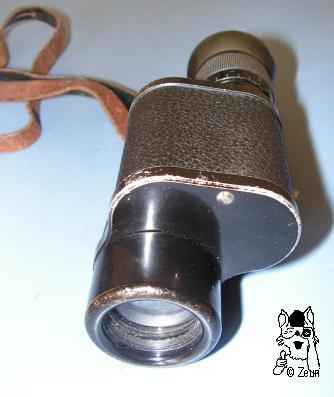 Das weitere "6x24" Modell stammt aus dem Jahre 1931 (s. S/N 1593518). Es hat einen schwarzen Lederköcher und ist ansonsten ebenfalls schwarz lackiert bzw. mit schwarzem Rauhkack ummantelt. Das erste Modell hat Messing-, das zweite Modell Aluminiumdeckel. Die Deckel sind beim frühen Modell dreifach, beim späteren Modell einfach verschraubt. Die Okularmuschel ist aus Bakelit. The other "6x24" model dates from 1931 (s. S/N 1593518). It comes with a black leather case. The brass objective, ocular and covers are also painted black, just as the housing is covered with black rough paint. The cover plates were first made of brass, then of aluminium. The covers of the early model have three, those of the later model have one screw only. The eye-cup is made of Bakelite.