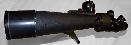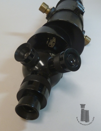 One surviving example is unmarked, but has a hard rubber covering on the top cover as well. Quite unusual, it comes with a spring lever stop for the eyepiece turret again. As one picture shows the Asem could not only be set up on a tripod but also on the Zeiss made table stand. A later 1939 Zeiss catalogue lets us assume that for a very short period a fourth design variant was issued by Zeiss, unless the catalogue drawing (detail of a sketch showing a sample of Zeiss observation telescopes) was not made according to the true design, or is supposed to represent the Asimara. The drawing shows that the Asem came with a yoke mount again (see second but last pic.). |