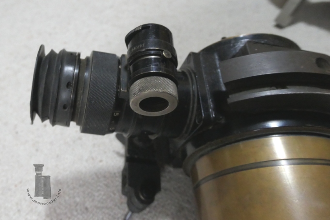 The Zeiss AA sighting telescope 7c was made between the wars. The Zeiss data sheet states that it was "intended for anti-aircraft guns" and "for combating air targets in direct fire"; a "bombardment of sea and land targets" is also possible. The special optics and mechanics in the main tube (3) allow a 360° rotation with an always upright and laterally correct image. A locking lever (15) on the housing can be snapped into the nose of the main tube (16) so that there is a fixed line of sight from the eyepiece to the lens, with the image offset by approx. 21 cm. If not locked it is hooked to the gun carriage to follow the movements. The lens cover glass is 40 mm in diameter. The eyepiece is screwed four times onto the round prism housing. It has an illumination window (8) and a diopter adjustment (12) of plus to minus 5 with corresponding line marks and numerals. There is a reticle with an interrupted crosshair with a pointed sighting mark in the eyepeice. The lighting unit (24, the specimen here comes with a differently constructed unit than the one in the orig. Zeiss photo) can be attached with a dovetail. The lighting can be regulated mechanically until dark. A filter glass wheel ("Skymglassrevolver", 6) on the cover side of the prism housing allows three filters to be swiveled in: grey, dark grey, green. Another rotary control (14) lets you switch between 4x and 8x magnifications. A small locking lever (13) must first be moved so that you can loosen a spring lever (15) and turn the magnification changer. There is a forehead rest mount (1) above the eyepiece. This can be easily moved from left to right by loosening a central wing screw, depending on the storage required. Depending on the eye to be used, the leather forehead rest can be inserted on the left or right with a square rod - fixed by a wing screw (2). A blind flap made of leather can be attached to this on the left or right with press studs. This is present in the specimen shown here. The original Zeiss manual and illustrations also provide a dual eyeguard fitted with normal eyecups (9) and gas mask eyecups (10), each with a blind eyecup. The normal eyecups are folded away when the gas mask is to be used. Inside the wooden box is a simple bellows-like soft rubber eyecup for the eyepiece. The present forehead rest deviates from the one shown in the photo of the contents of the box (see this at L.Z.F. 2a picture 6, 13). |